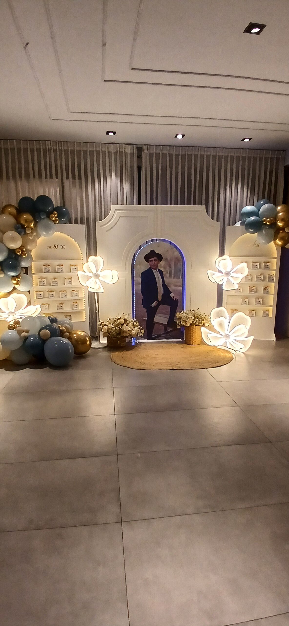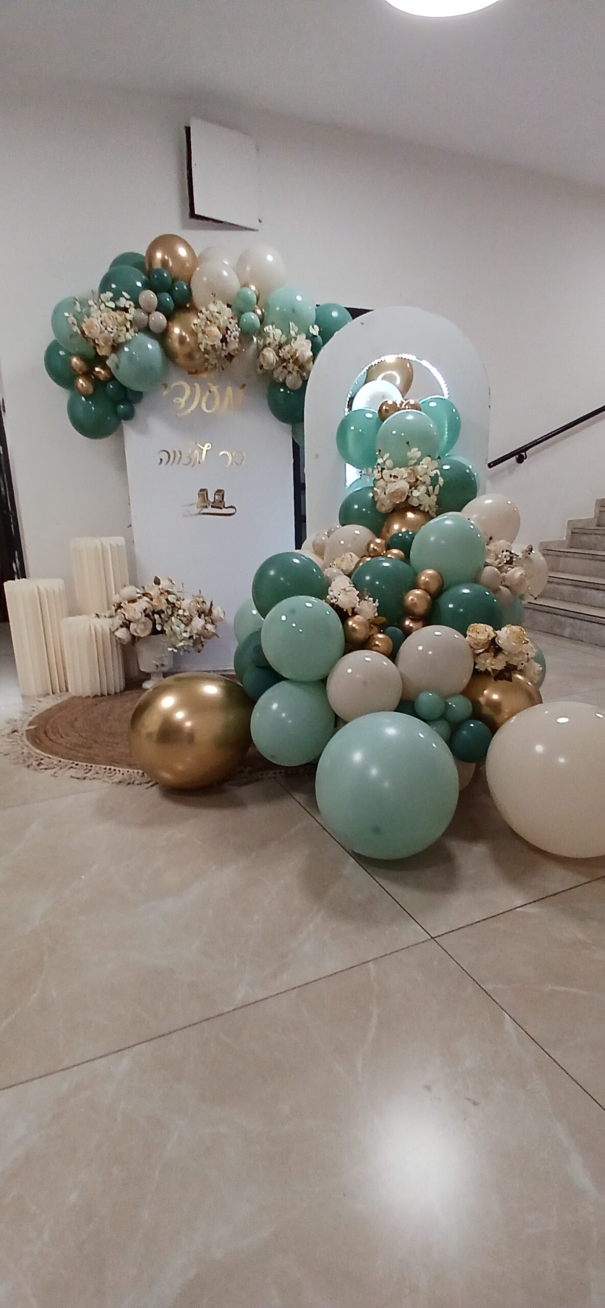עמדת צילום מושלמת הכוללת קיר צילום עם כיתוב ענק מוקף בבלונים בעיצוב אורגני +דובי ענק אוחז זר בלונים +3 עמודונים בגדלים שונים